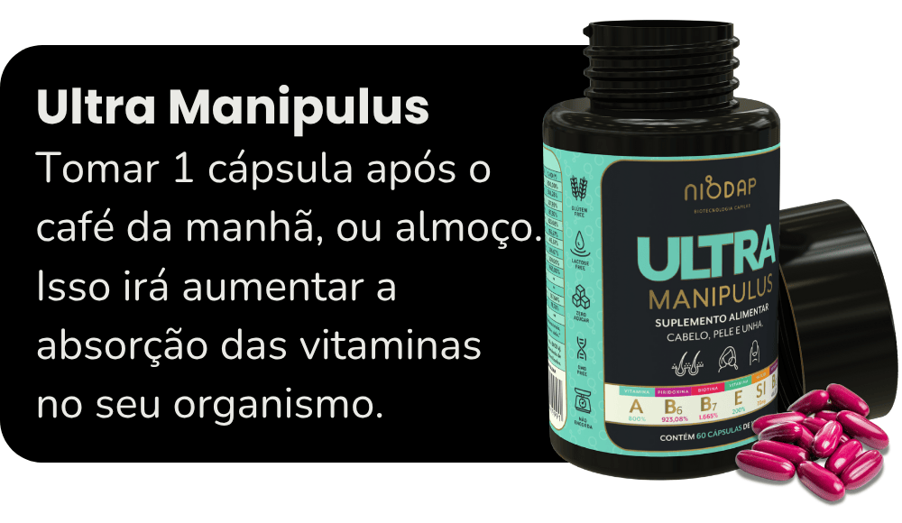 A Ultra Manipulus é um suplemento vitamínico desenvolvido para fortalecer os fios, estimular o crescimento e reduzir a queda de cabelo, agindo de dentro para fora.